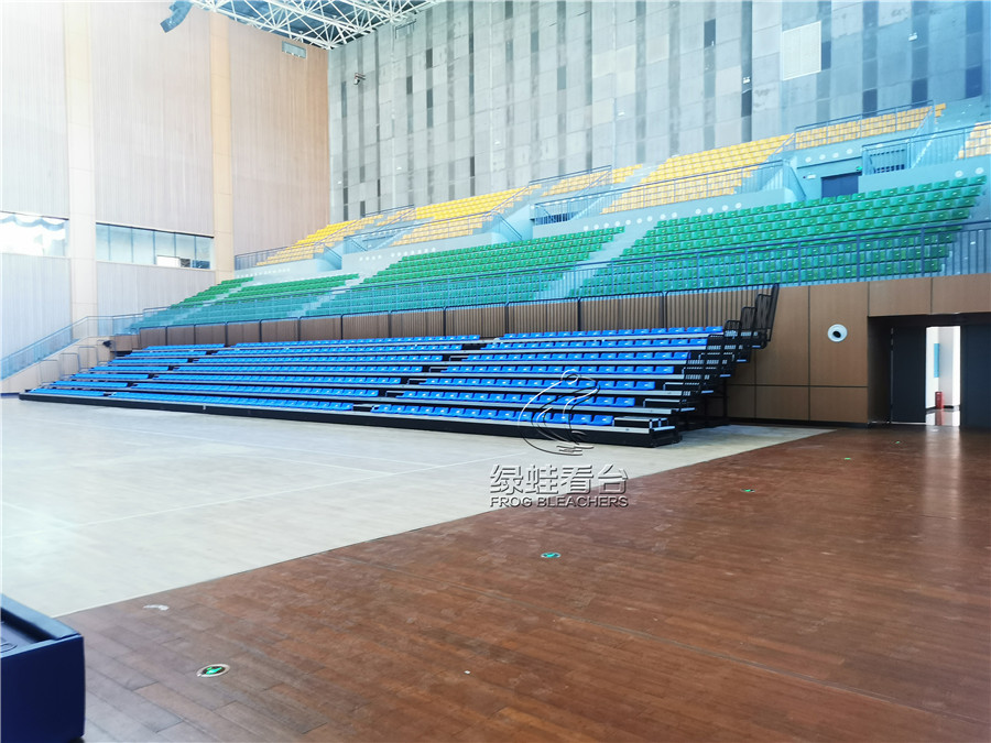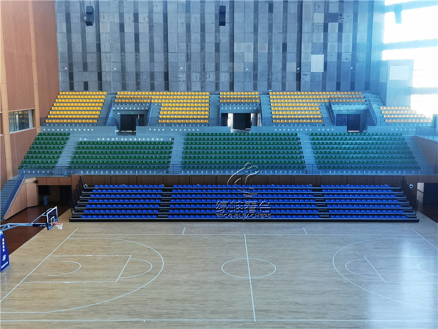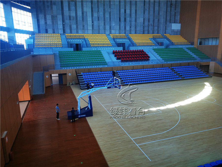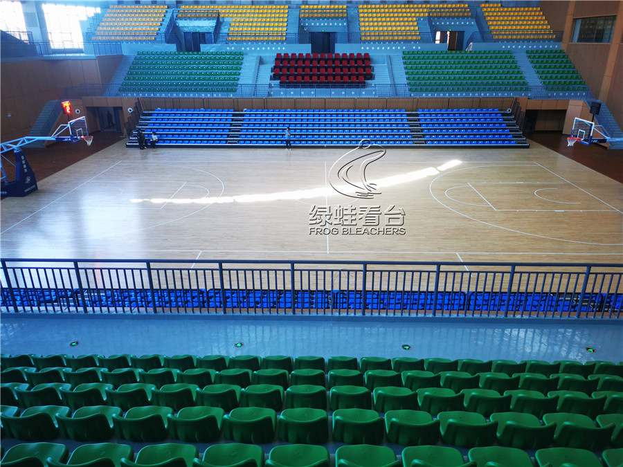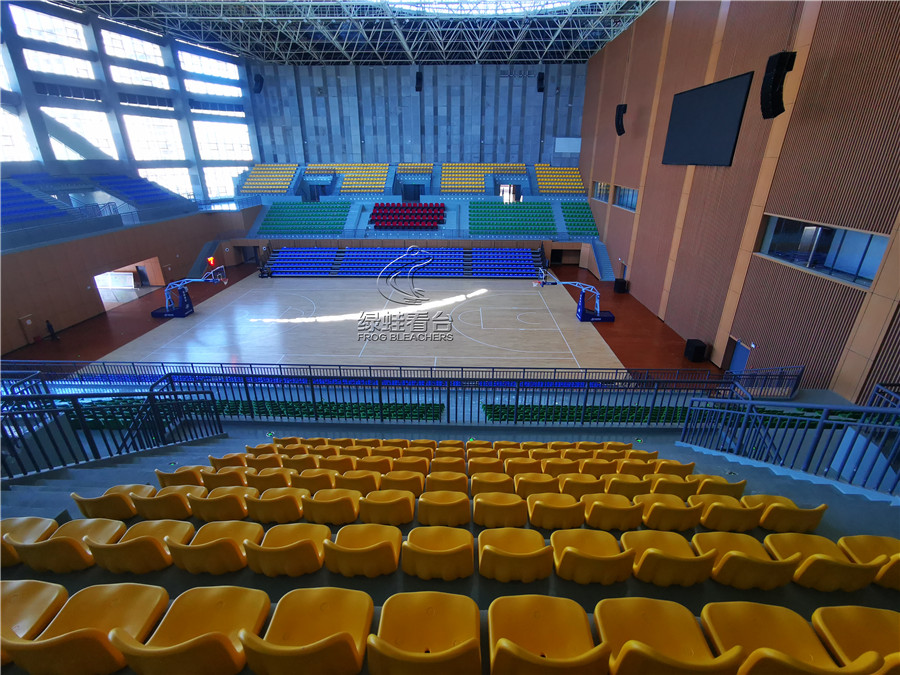綠蛙看臺承接的正是該籃球場館的看臺座椅項目,共安裝搭建固定座椅2271個, 中靠背吹塑椅電動伸縮看臺784個, 低靠背吹塑椅主席臺椅50座,安裝的電動伸縮看臺可針對情況隨時調整,方便賽事的開展與日常場館管理,實在是方便。座椅通過顏色分區,醒目且富有運動活力的氣息,目前看臺座椅設備已全部完成安裝調試,可隨時投入使用。