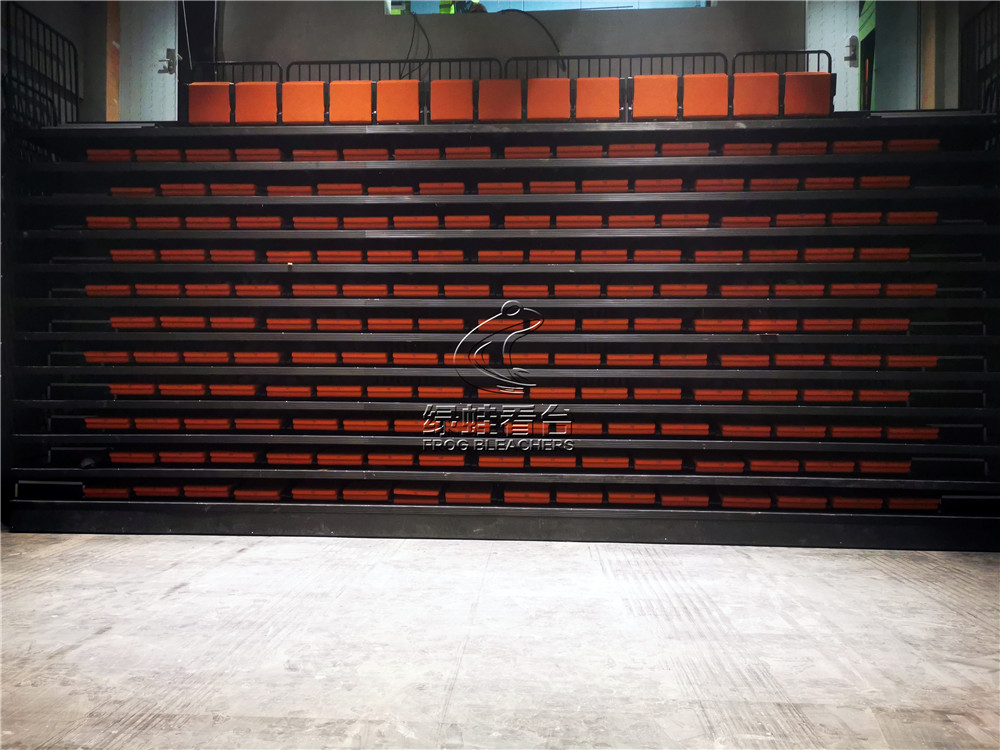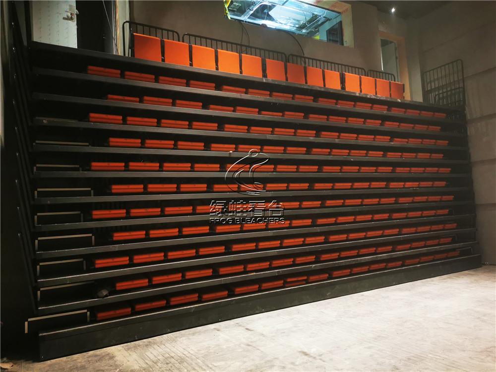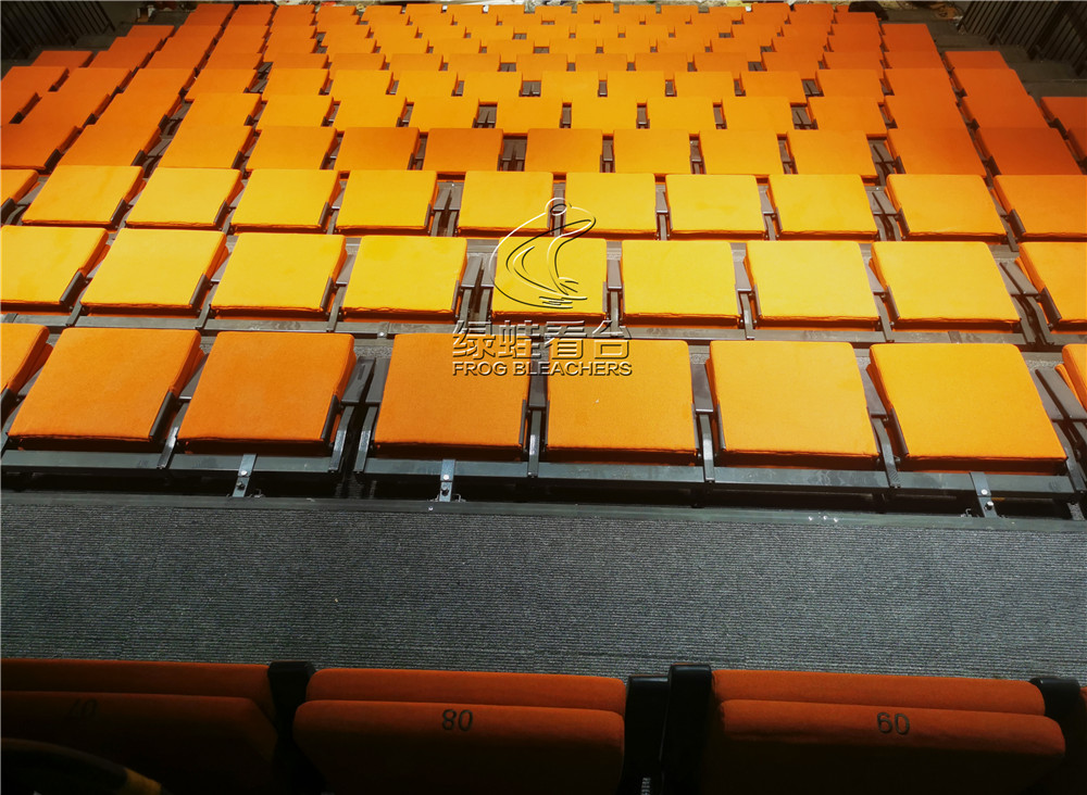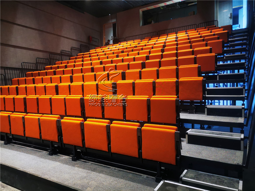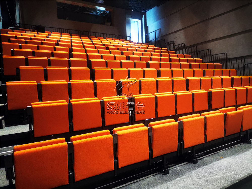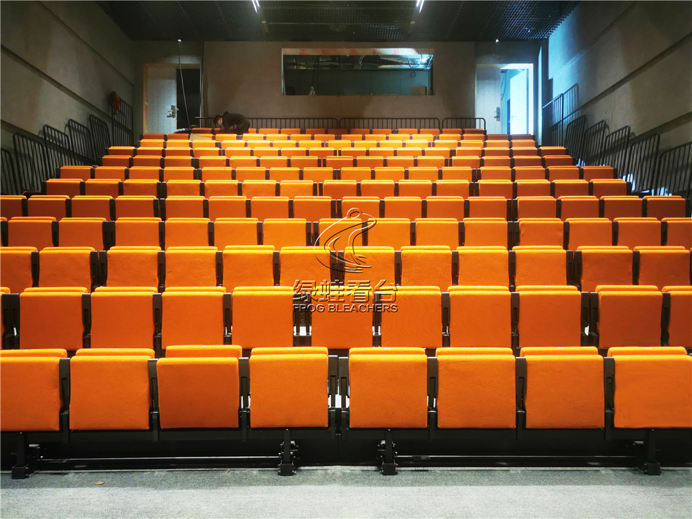 綠蛙看臺承接了深圳天鵝湖劇場中的電動伸縮看臺安裝調試項目,項目配置了后置式包棉座椅,座椅采取錯位安裝,增加觀眾視線的通透性。座椅顏色客戶選擇了明亮的橘色,整體效果別有一番風味。