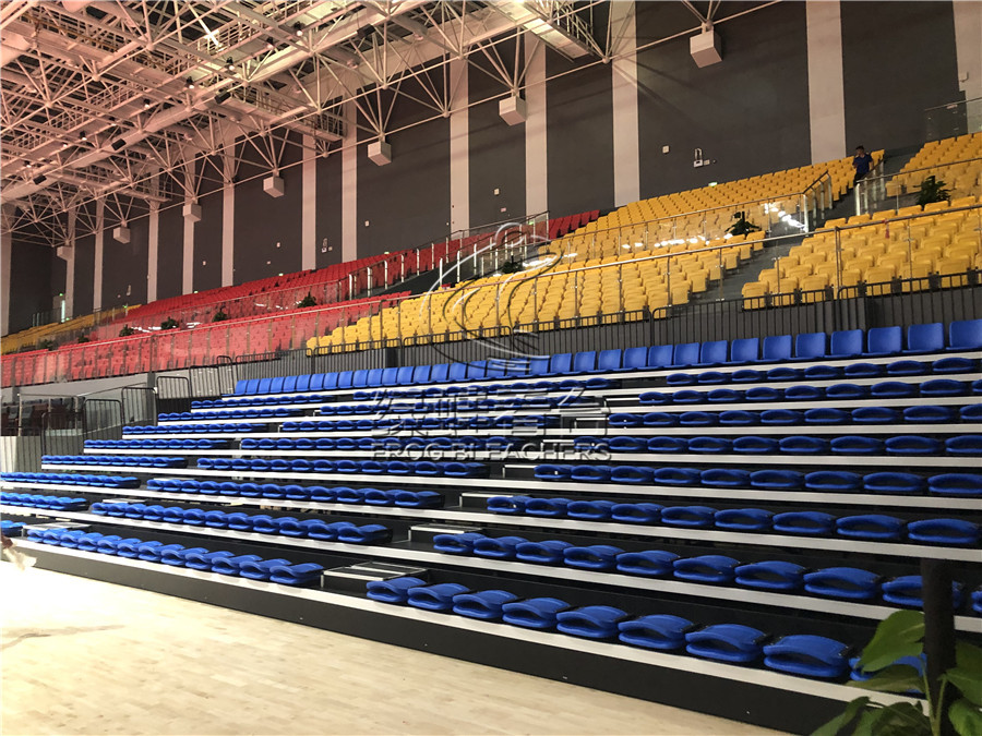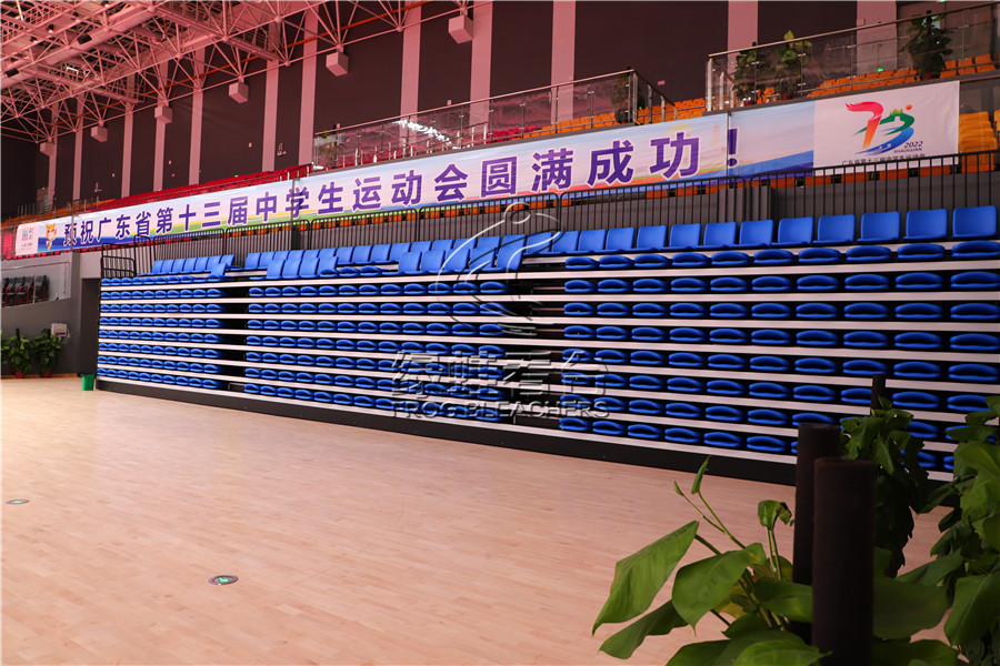 一層的活動伸縮看臺采用的是電動前置式翻板吹塑座椅,采用靜電噴涂處理,層寬850mm,尾層寬500。首層高330mm,錯層高300mm,活動看臺踏板材料選用17mm防火防滑舞臺板。