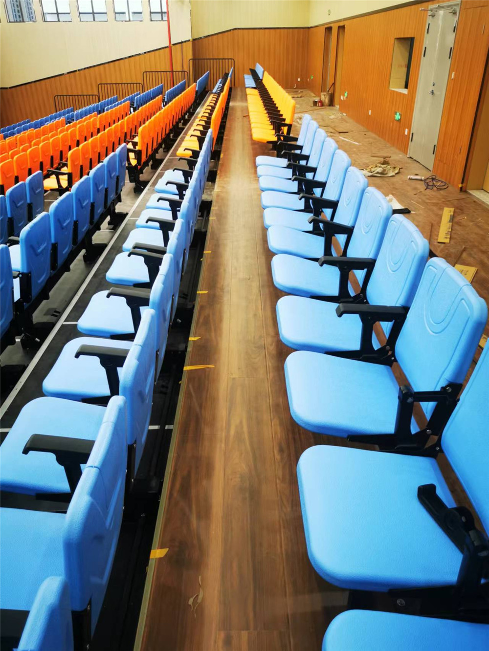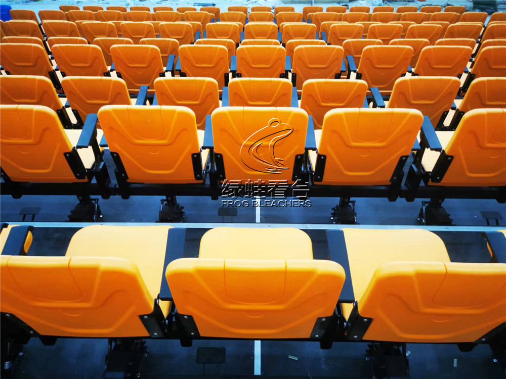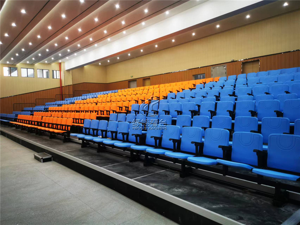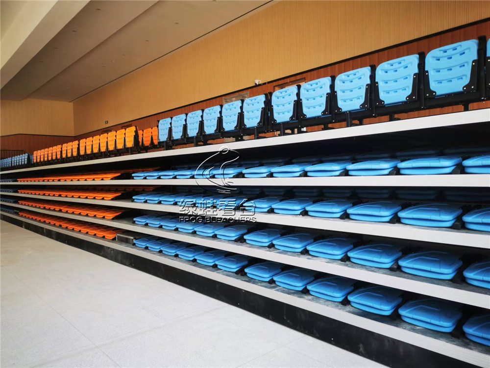 活動(dòng)看臺(tái)采用鋼焊接組裝連接,所有安裝用鋼件均采用靜電噴涂處理,層寬1800mm。首層高330mm,錯(cuò)層高400mm, 活動(dòng)看臺(tái)踏板材料選用17mm防火防滑舞臺(tái)板,活動(dòng)看臺(tái)為電動(dòng)控制,保證左右行走距離一致,在伸展與回縮中無定向跑偏、卡死、打滑、跳齒現(xiàn)象。活動(dòng)看臺(tái)觀眾席采用高靠背吹塑翻板座椅,后置式安裝方式,座距490mm,后邊和側(cè)邊(第一層除外)加安全防護(hù)欄桿,欄桿高度為1100mm;并且看臺(tái)展開時(shí),即處于使用狀態(tài)下,觀眾可通過伸縮看臺(tái)的走道直通二樓區(qū)域。