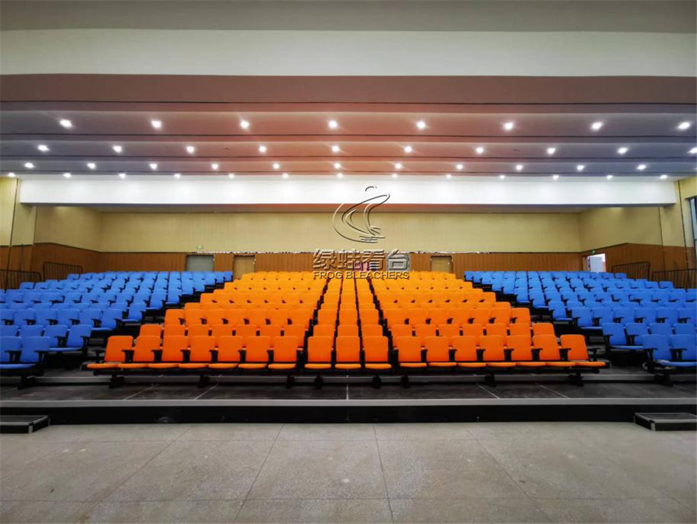 多功能廳分為兩層,一樓為多功能活動(dòng)區(qū)域,擺放伸縮看臺(tái);二樓為雜物間洗手間等,二樓靠前端的位置擺放一排固定座椅,座椅款式與伸縮看臺(tái)同款。其中伸縮看臺(tái)部分座位數(shù)量為410座,固定看臺(tái)座位數(shù)量為41座。