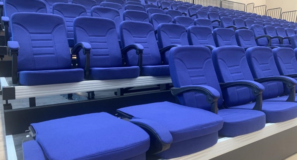 為給觀眾營造一個良好的氛圍,座椅選用前置式軟包座椅,全布藝款式,扶手部分也添加了絨布,整體提升了觀眾的舒適度。座椅顏色為深藍色,高度契合了佛山南海歷史文化名人,康有為的深沉厚重的大儒形象。