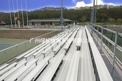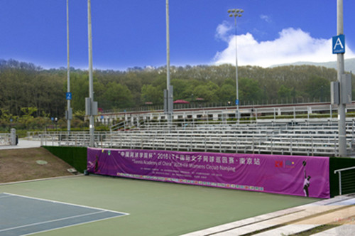 中國網球學院網球場采用鋁制看臺,鋁制看臺在國外被大量的應用,原因在于看臺造價不高,耐用實用。看臺基礎架采用鋼結構鍍鋅,座板踏板采用鋁合金型材,長期置于室外不會因生銹對看臺造成損傷。