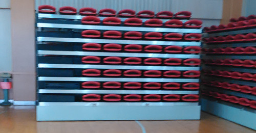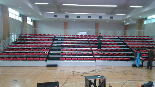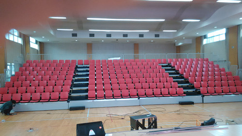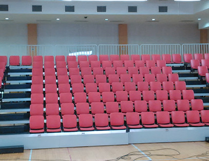 上海打虎山路第一小學體育館,采用可移動式伸縮看臺,用時4組展開拼在一起,美觀大氣,座椅采用折疊翻板靠背椅,坐感舒適。不用時分開收攏靠墻,不占地方。座椅顏色為紅色,底座灰色,整體協調。