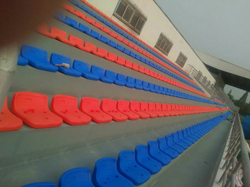溫州職業技術學院體育場,固定式看臺,采用低靠背中空吹塑椅,藍橙搭配,美觀大方。