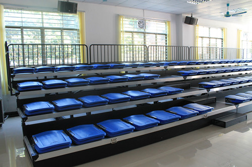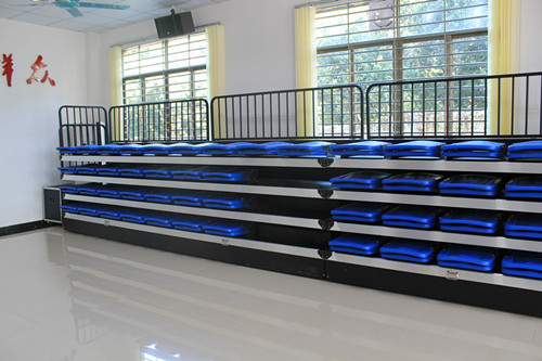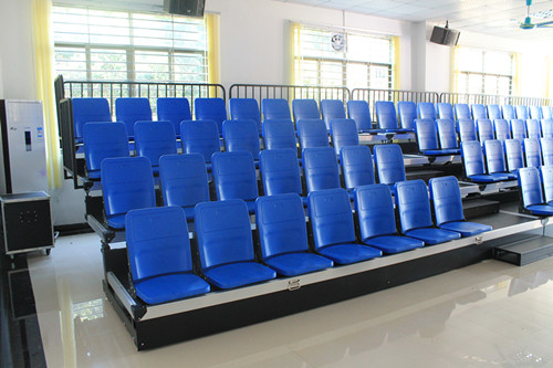 該看臺為手動可移動式伸縮看臺,看臺總共4層,座椅采用高靠背翻版折疊椅。看臺不使用時可以折疊靠墻,也可以推走。