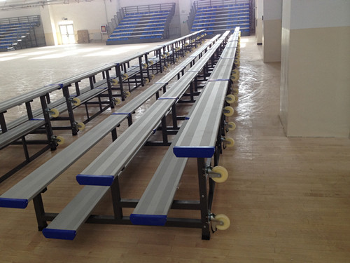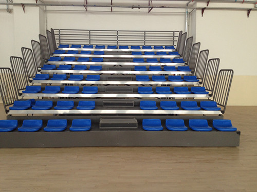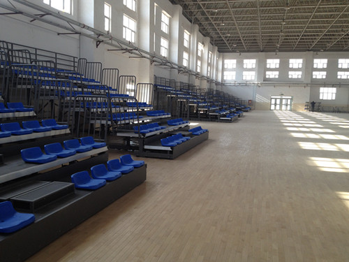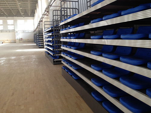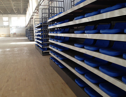 該看臺為電動(dòng)伸縮看臺和輪式可翻轉(zhuǎn)看臺組合,可以滿足場地的多功能使用。當(dāng)使用中間的籃球場地進(jìn)行比賽時(shí),伸縮看臺全部展開,輪式可翻轉(zhuǎn)看臺置于籃球場南北兩側(cè),可滿足800人的觀眾座位數(shù)。