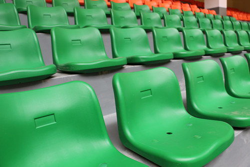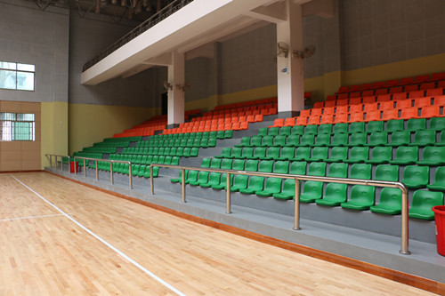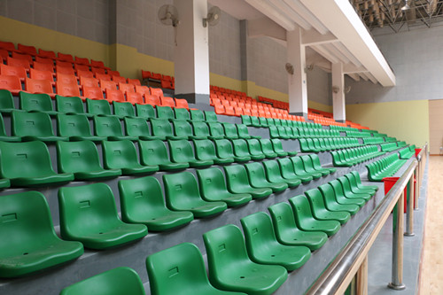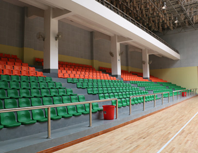 郴州六中學校體育館采用固定看臺,中靠背中空吹塑椅,綠色與橙色相結合,營造出活潑動感的氛圍,與運動木地板渾然一體。