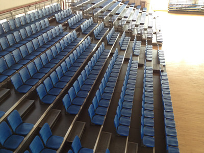 蔡塘學校伸縮看臺分為電動和手動兩部分,座椅采用藍顏色高靠背翻板椅,前置式安裝,整體較為美觀。