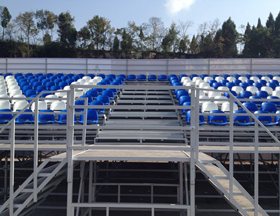 該看臺屬斜梁式拼裝看臺,整體結(jié)構(gòu)采用標準件、模塊化設(shè)計,看臺的各種部件,如支架,踏板,側(cè)板,護欄,座椅等,皆可隨意 搭配組裝,可根據(jù)場地及觀眾席位需要進行各種層高、位數(shù)的拼裝組合。具有結(jié)構(gòu)簡單,搭建及拆卸方便,便于運輸及儲存等特點。