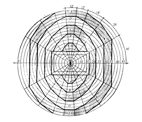 1)視角:觀眾視線與視平線之間的夾角,分為水平視角和垂直視角兩種。 最佳視角是確保視線質量的重要因素。一般來說視角高度角不宜超過45度,最低不宜低于5度。水平方位角由于體育館比賽 場地是長方形,從觀眾入席實測記錄表明,座席視距大小,高角度的大小(樓廂高度角較堂廂高度視覺質量差)是影響觀 眾座席視覺質量的主要因素。