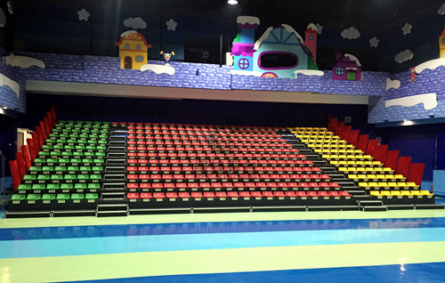 亞特蘭親子酒店的BIBI歡樂城堡里選用的中空吹塑低靠背電動伸縮看臺,看臺共有12層,最大限度的利用場地來滿足觀眾觀看節目需求。