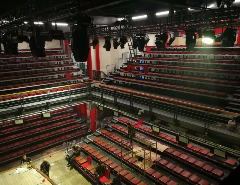 觀眾席采用高靠背軟包座椅手動伸縮看臺,現場能容納500名觀眾。為力求節目最好的觀賞效果,綠蛙看臺根據整個場館的舞臺及空間位置特點,對上下樓的每組看臺起高及錯層高均為量身定做。服務好客戶,是綠蛙看臺的本職所在。