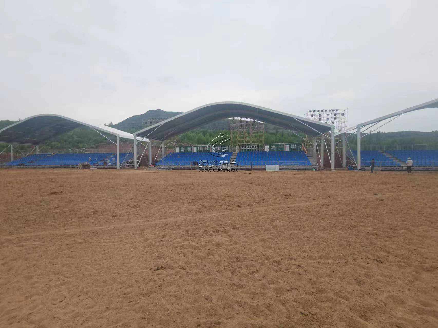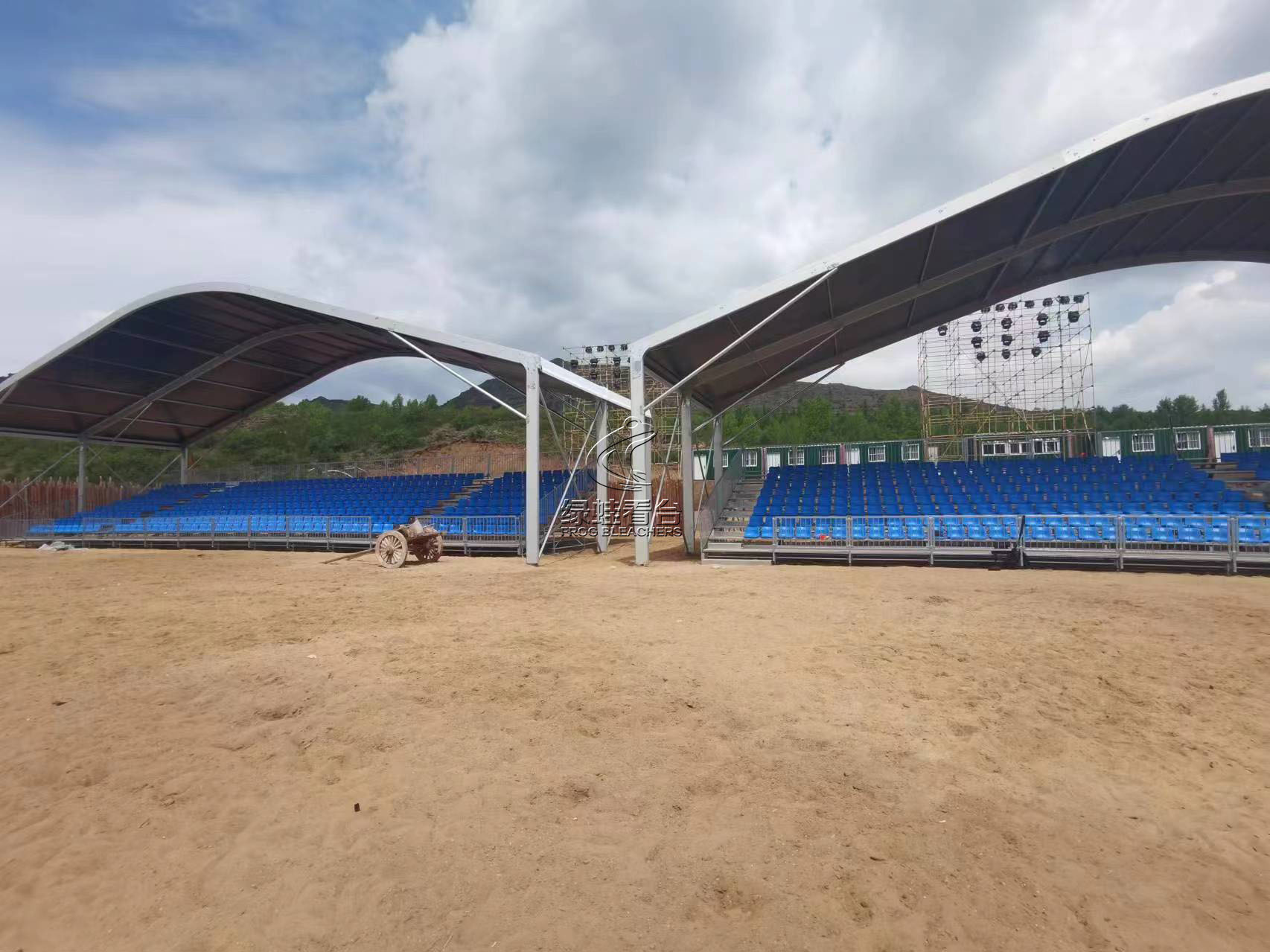 1、看臺分三大組,每組都有獨立的遮陽棚。看臺座椅間距:480mm,看臺首層高400mm、錯層高300mm,層寬800mm,尾層寬500mm。
