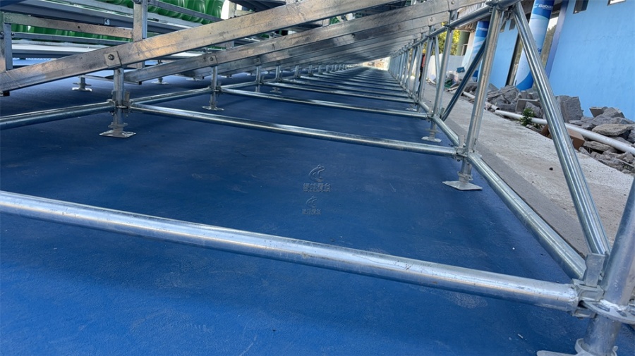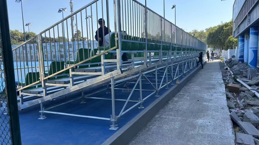 本看臺(tái)采用快速拼裝式看臺(tái)(模塊式安裝)。φ48X3焊管立柱,踏板采用鋁合金板,每平方米承重不低于500KG,首層從地面起,錯(cuò)層高250mm(不含座椅),層寬750mm,左右兩側(cè)及尾層需加不銹鋼安全防護(hù)欄,高度1100mm.看臺(tái)支架鋼材表面采用鍍鋅處理;