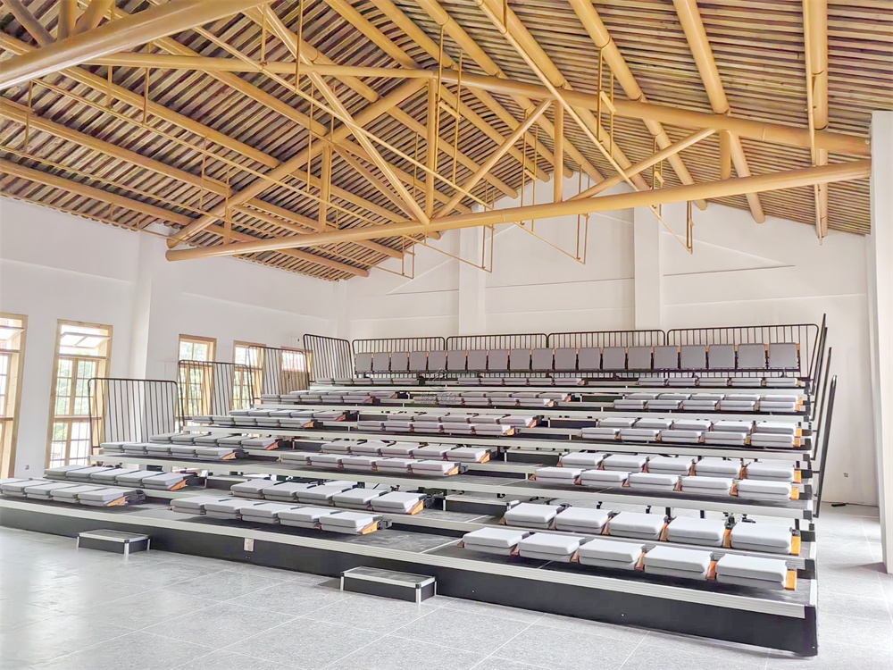 伸縮看臺座椅采用帶扶手全封布軟包座椅,后置式安裝方式,顏色為灰色,配合室內裝修風格。一層裝雙排,同層雙排前后高度錯開。座距520mm,后邊和側邊(第一層除外)加安全防護欄桿,欄桿高度為1100mm。