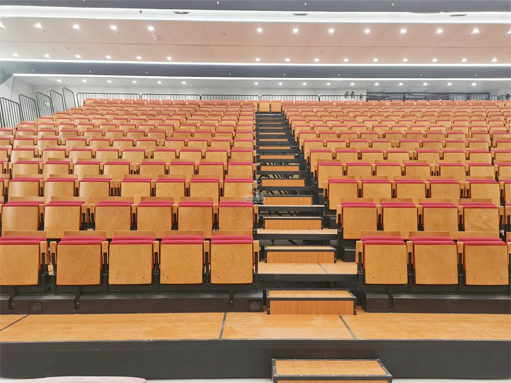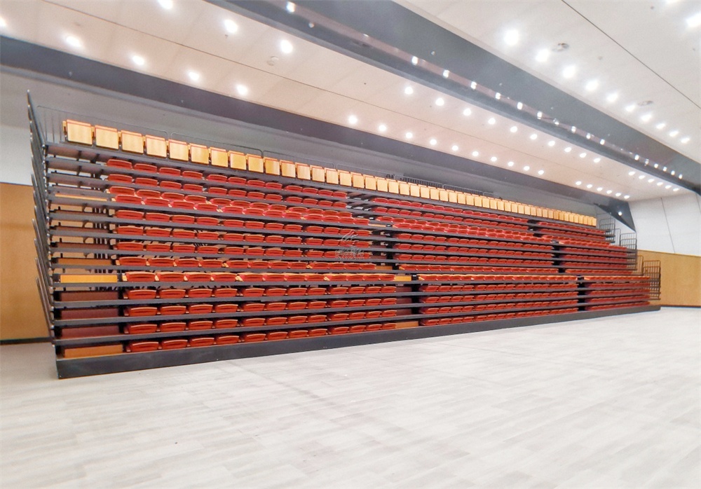 看臺層寬950mm,首層高330mm,錯層高300mm,看臺踏板材料選用17mm夾層板,表面顏色為木色;伸縮看臺為電動控制,保證左右行走距離一致,在伸展與回縮中無定向跑偏、卡死、打滑、跳齒現象