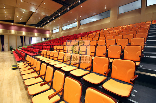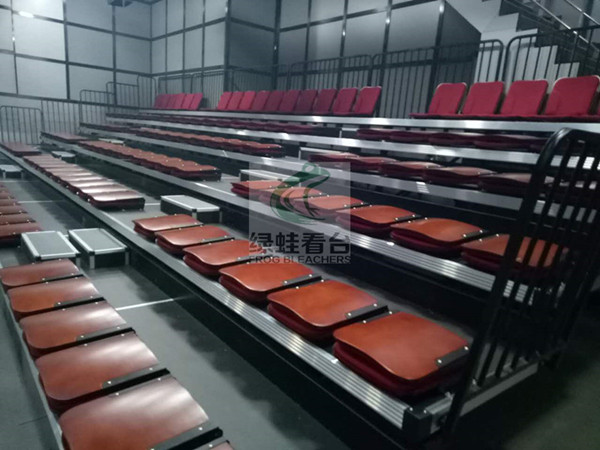 伸縮看臺又分為座椅前置式安裝和座椅后置式安裝。前置式伸縮看臺主要是指座椅直接固定在活動看臺床架上,以低靠背、平靠背、靠背可翻轉折疊椅、鋁合金座板等座椅椅面選擇為主。后置式伸縮看臺主要用于對層高要求比較窄,且追求高檔的情形下。