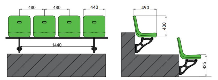 座椅采用側裝方式的座椅,椅面距地面高度約為420mm左右,座椅支架選用優質壓鑄鋁支架連接鍍鋅圓管。壓鑄鋁支架采用靜電噴塑處理。支架采用M10×80的擊芯膨脹螺栓與看臺水泥壁面相連,每個膨脹螺栓可抗力100kg以上。鍍鋅圓管外徑不少于φ32mm,厚度不少于2mm。圓管兩端采用橡膠塞頭封口。緊固件、座椅連接件采用鍍鋅處理。