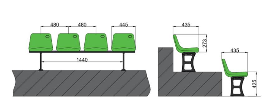 座椅采用站立式安裝方式的座椅,椅面距地面高度約為420mm左右,座椅支架選用優質壓鑄鋁支架連接鍍鋅圓管。壓鑄鋁支架采用靜電噴塑處理。支架采用M10×80的擊芯膨脹螺栓與看臺水泥壁面相連,每個膨脹螺栓可抗力100kg以上。鍍鋅圓管外徑不少于φ32mm,厚度不少于2mm。圓管兩端采用橡膠塞頭封口。緊固件、座椅連接件采用鍍鋅處理。