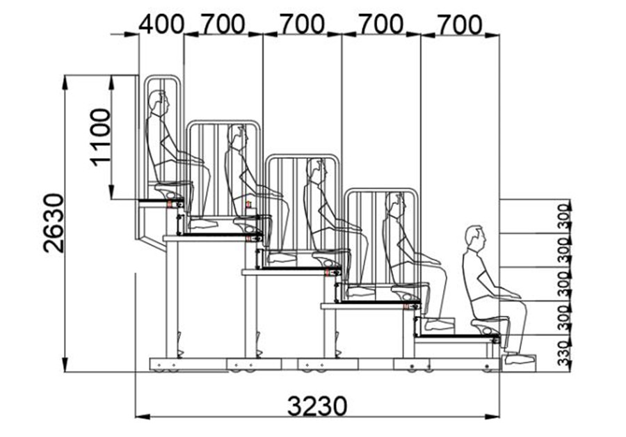 (2)看臺整體為垂直支撐結構。看臺層寬700mm,尾層寬400mm;首層高330mm,其他層高300mm。(伸縮看臺為定制產品,可根據實際場地和客戶需求,略微調整尺寸。)