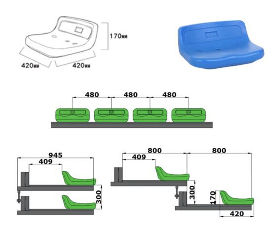 活動(dòng)看臺(tái)座椅采用低靠背中空吹塑座椅,前置式安裝。座椅上有三個(gè)安裝孔,透過(guò)座椅安裝孔將座椅直接安裝在看臺(tái)的踏板上,不需要任何金屬連接片。