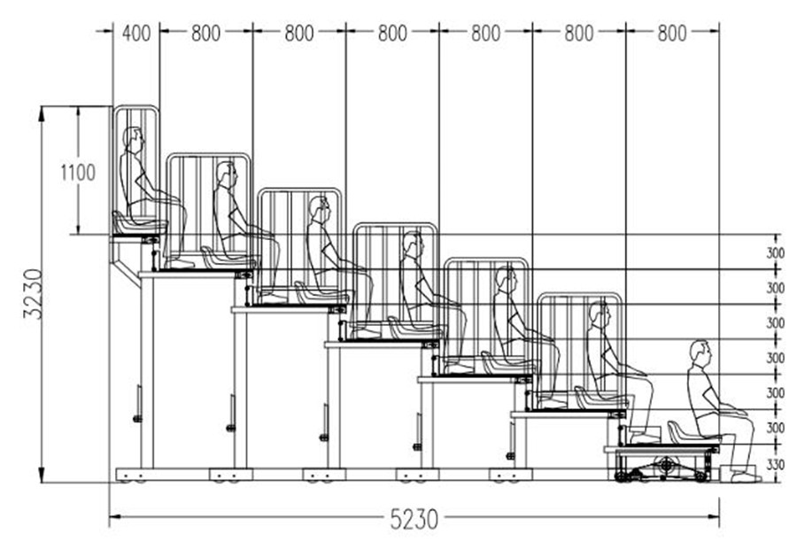 (2)看臺(tái)整體為垂直支撐結(jié)構(gòu)。看臺(tái)層寬800mm,尾層寬400mm;首層高330mm,其他層高300mm。(伸縮看臺(tái)為定制產(chǎn)品,可根據(jù)實(shí)際場(chǎng)地和客戶(hù)需求,略微調(diào)整尺寸。)