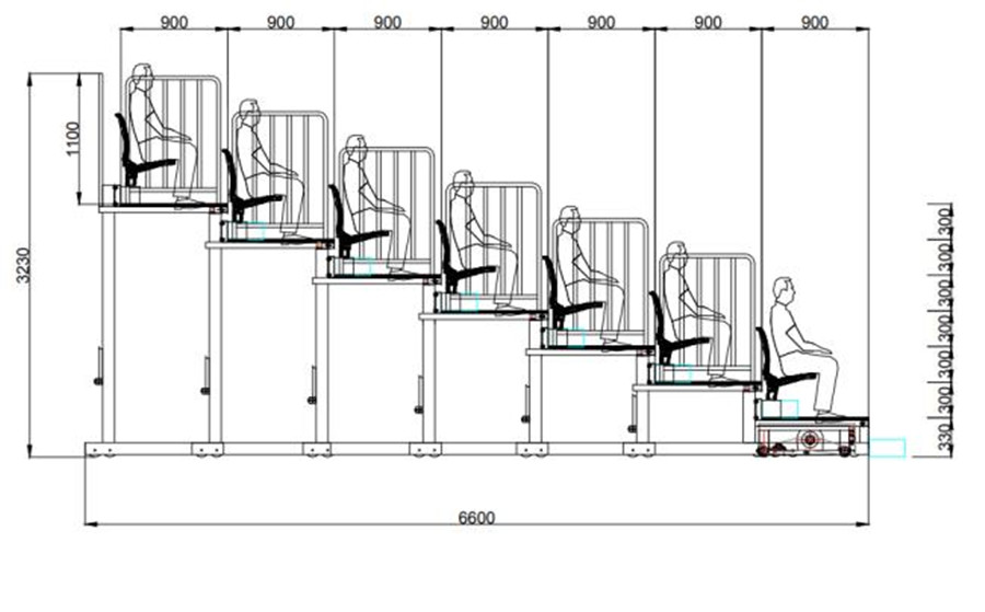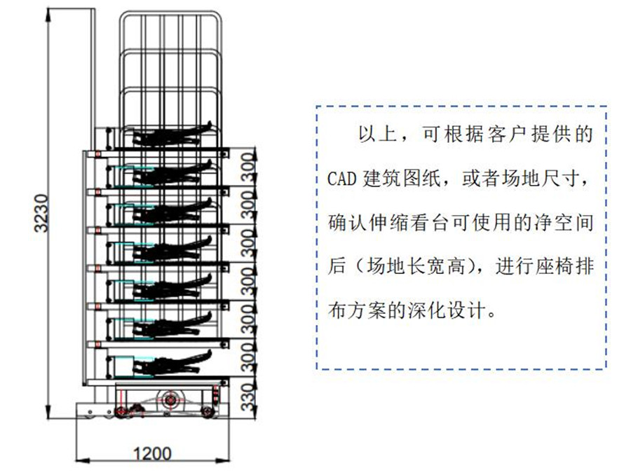 (2)看臺整體為垂直支撐結構。看臺層寬900mm,尾層寬900mm;首層高330mm,其他層高300mm。(伸縮看臺為定制產品,可根據實際場地和客戶需求,略微調整尺寸。)
