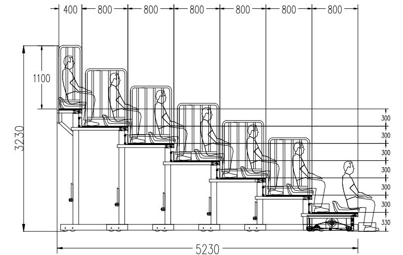(2)看臺整體為垂直支撐結構。看臺層寬800mm,尾層寬400mm;首層高330mm,其他層高300mm。(伸縮看臺為定制產品,可根據實際場地和客戶需求,略微調整尺寸。)