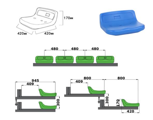 活動看臺座椅采用低靠背中空吹塑座椅,前置式安裝。座椅上有三個安裝孔,透過座椅安裝孔將座椅直接安裝在看臺的踏板上,不需要任何金屬連接片。