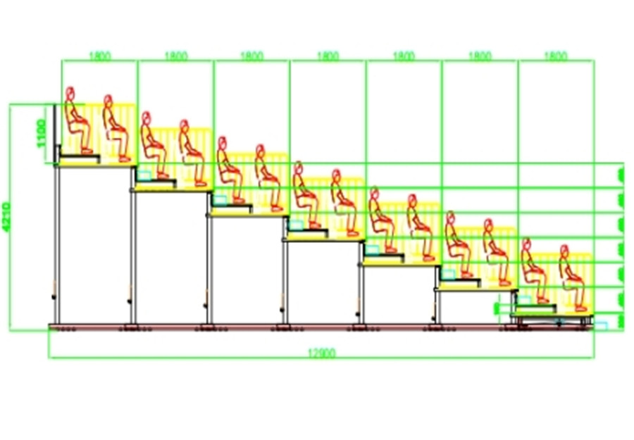 (2)看臺(tái)整體為垂直支撐結(jié)構(gòu)。看臺(tái)層寬1800mm,一層擺雙排后置式座椅,同一層雙排座椅高差200mm,首層高330mm,其他層高400mm。