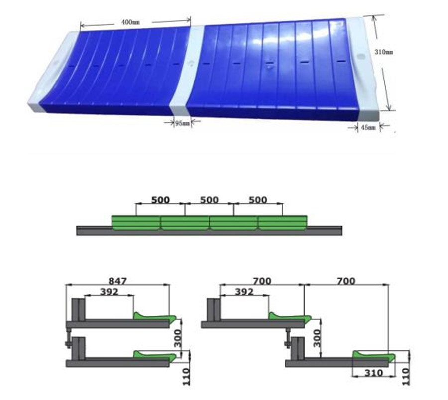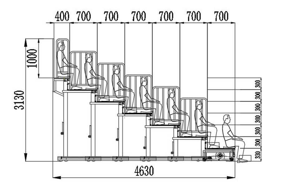 (2)看臺(tái)整體為垂直支撐結(jié)構(gòu)。看臺(tái)層寬700mm,尾層寬400mm;首層高330mm,其他層高300mm。(伸縮看臺(tái)為定制產(chǎn)品,可根據(jù)實(shí)際場(chǎng)地和客戶需求,略微調(diào)整尺寸。)